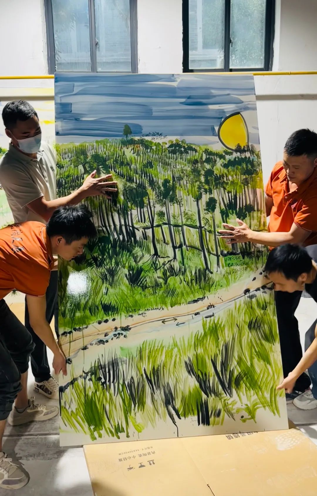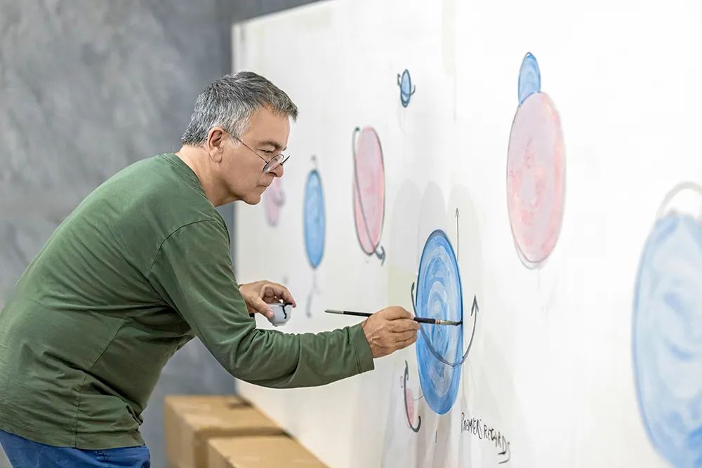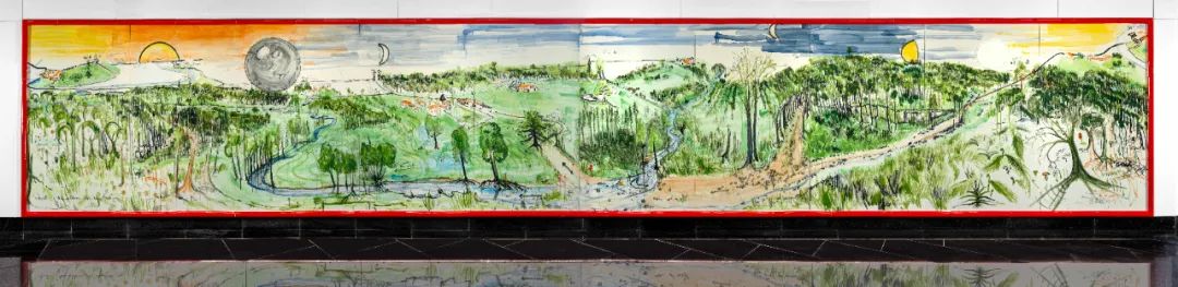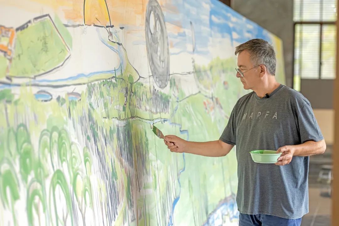 《城市·森林》的創作靈感源于法布里斯對上海充滿活力的印象,他決定展現自己生長的山谷全景。為呈現遼闊景象,我們工廠制作并拼接了多塊大型瓷板,形成寬12米、高2米的巨幅畫作。由于瓷板重量,銜接成巨大挑戰,但技藝精湛的匠人確保了其天衣無縫。為還原山谷風貌,我們準備了各式畫筆和近百種顏色釉,在法布里斯的手里,這些工具和材料仿佛被賦予生命,最終呈現出一幅生動的山谷風景畫卷。